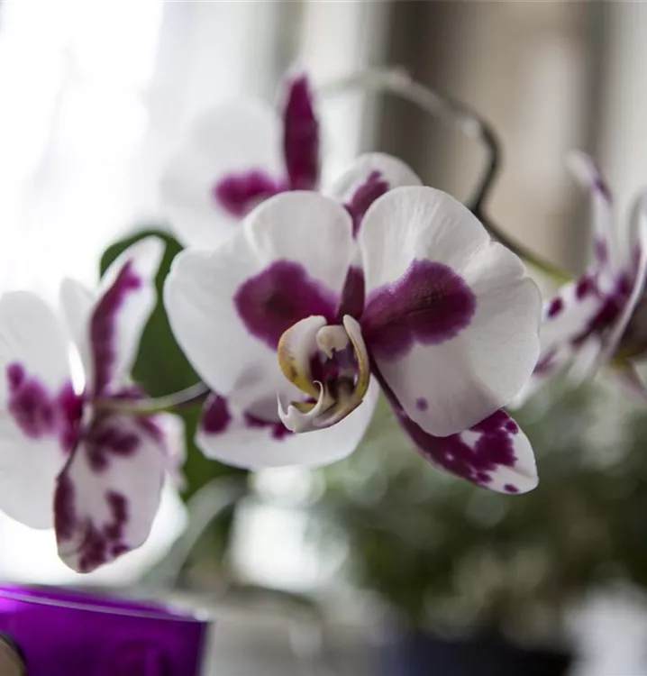 Phalaenopsis bringt von Januar bis Dezember dekorative, lippenförmige, in Rispen angeordnete, weiße, rosafarbene, hellgelbe, pinke oder dunkelrote Blüten hervor. .