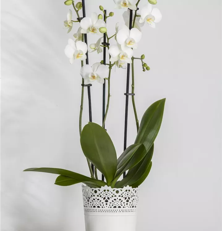 Phalaenopsis 'Tropic Snowball' bringt von Januar bis Dezember dekorative weiße Blüten hervor.