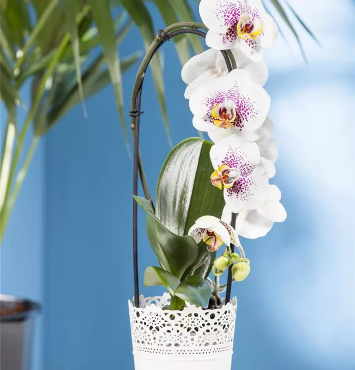 Die Schmetterlingsorchidee 'Waterfall' (Phalaenopsis) ist eine schöne, in verschiedenen Farben blühende Orchidee. Ihre lippenförmigen Blüten sind sehr dekorativ und erscheinen in Rispen von Januar bis Dezember. Für das optimale Wachstum sorgen ein heller Standort sowie ein spezielles Orchideen-Substrat.