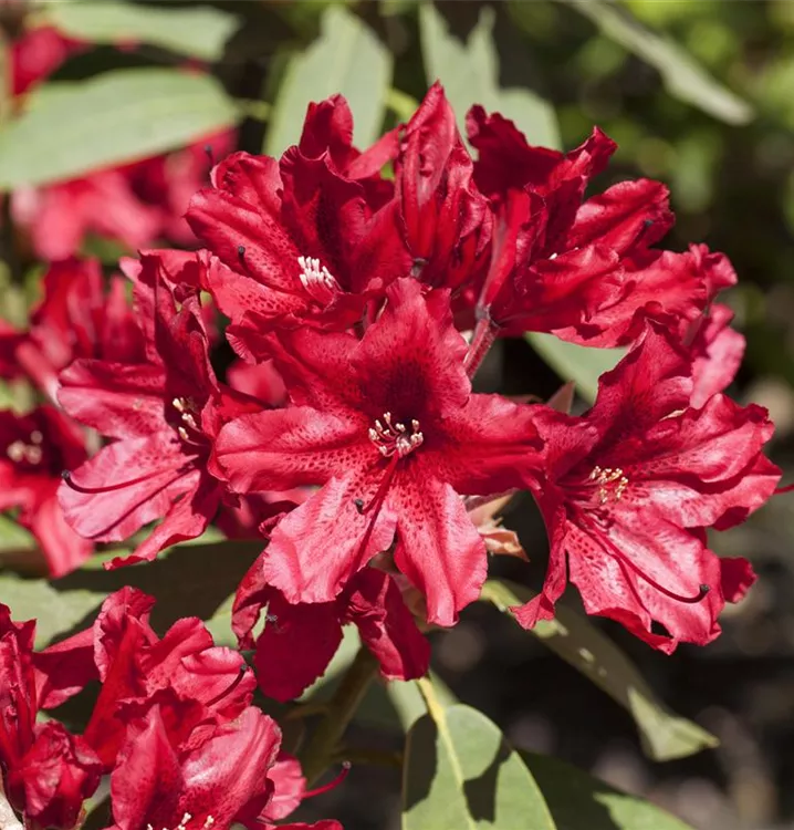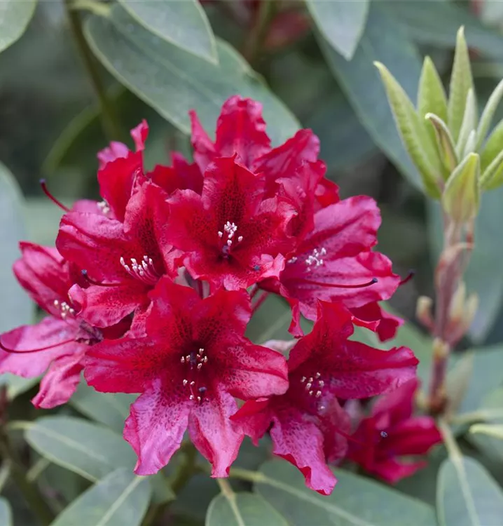 Der Großblumige Rhododendron ist immergrün und trägt dunkelgrüne lanzettliche Blätter.
