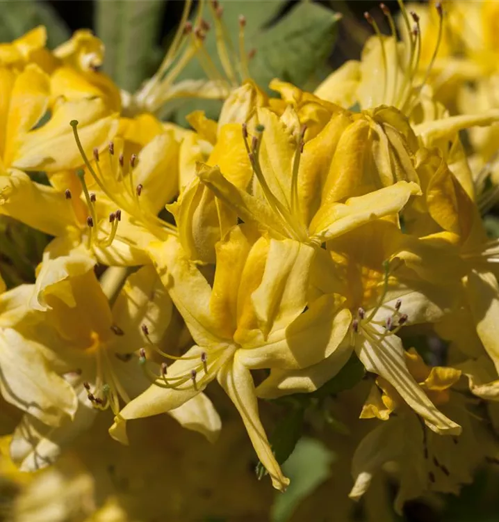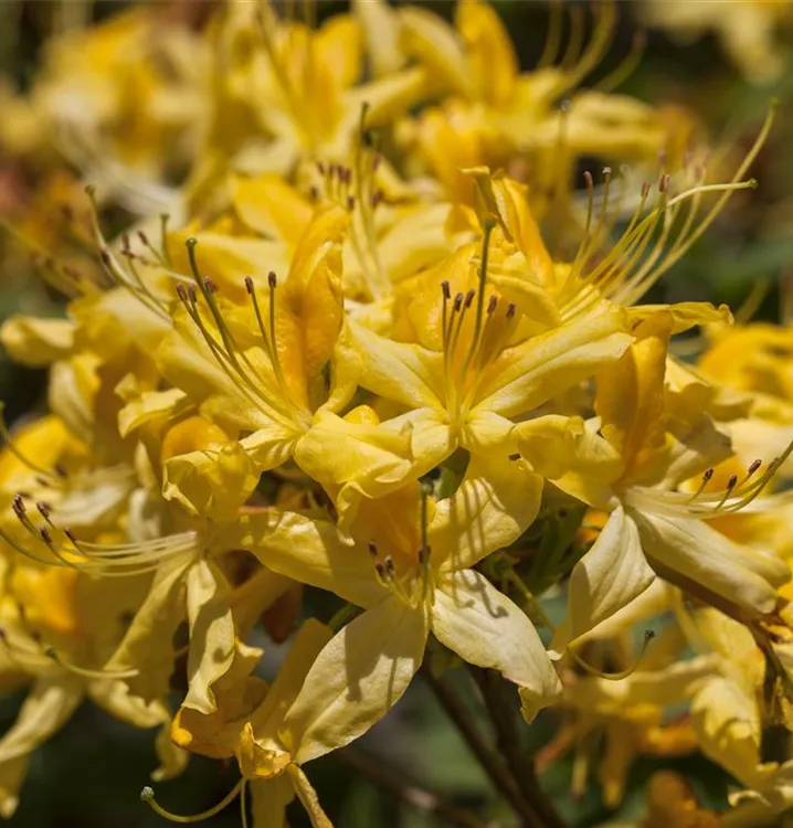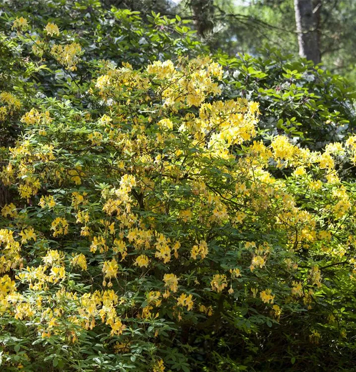 Die Laubabwerfende Azalee (Rhododendron luteum) bringt von Mitte Mai bis Ende Juni ein wahres Blütenmeer in gelb hervor. Ihr sommergrünes Laub ist mittelgrün. Im Herbst verwandeln sich das Laub in Purpurrot. Dieses aufrecht, buschig, breit, kompakt, verzweigt wachsende Gehölz erreicht gewöhnlich eine Höhe von 2 - 3 m und eine Breite von 2 bis 3 m. Ein halbschattiger (bis schattiger) Standort und ein humoser, kalkfreier Boden schaffen optimale Bedingungen für ein gesundes Wachstum. Die Laubabwerfende Azalee ist gut frostverträglich.