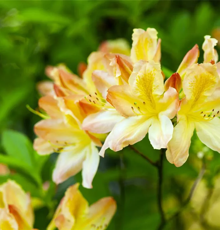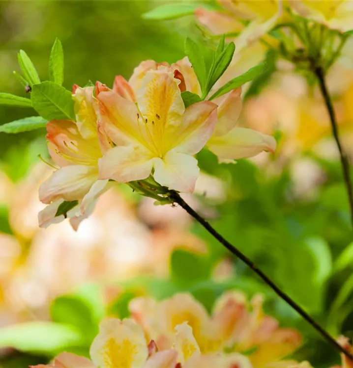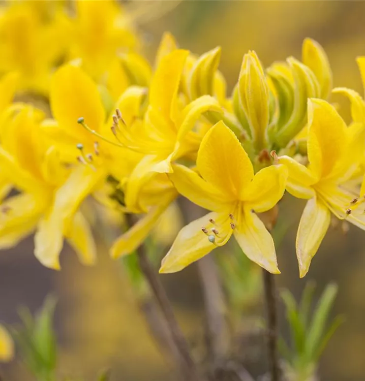 Die gelben, trichterförmigen Blüten der Laubabwerfende Azalee erscheinen in Dolden von Mitte Mai bis Ende Juni. Diese sind stark duftend.