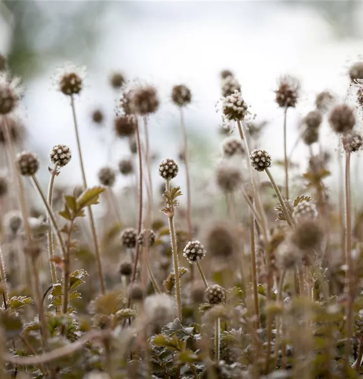 Acaena microphylla bildet ballförmige, cremeweiße Blüten ab Juni.