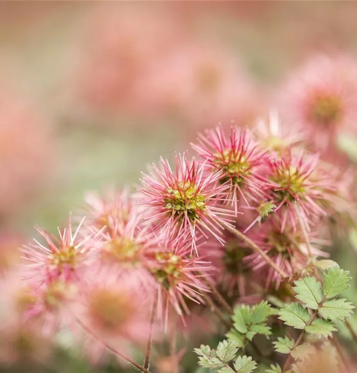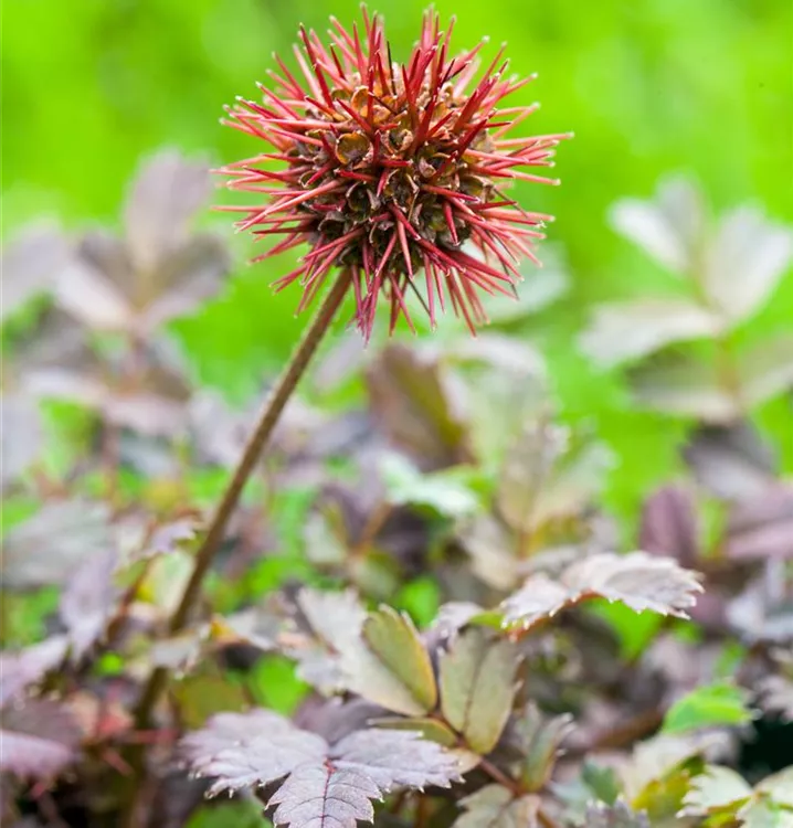 Besonders dekorativ sind die bronzefarbenen Früchte von Acaena microphylla. Diese erscheinen ab August.