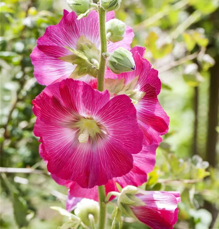 Alcea rosea bildet schalenförmige, in Trauben angeordnete, gelbe, lilafarbene, pinke, rosafarbene, weiße Blüten ab Juli.