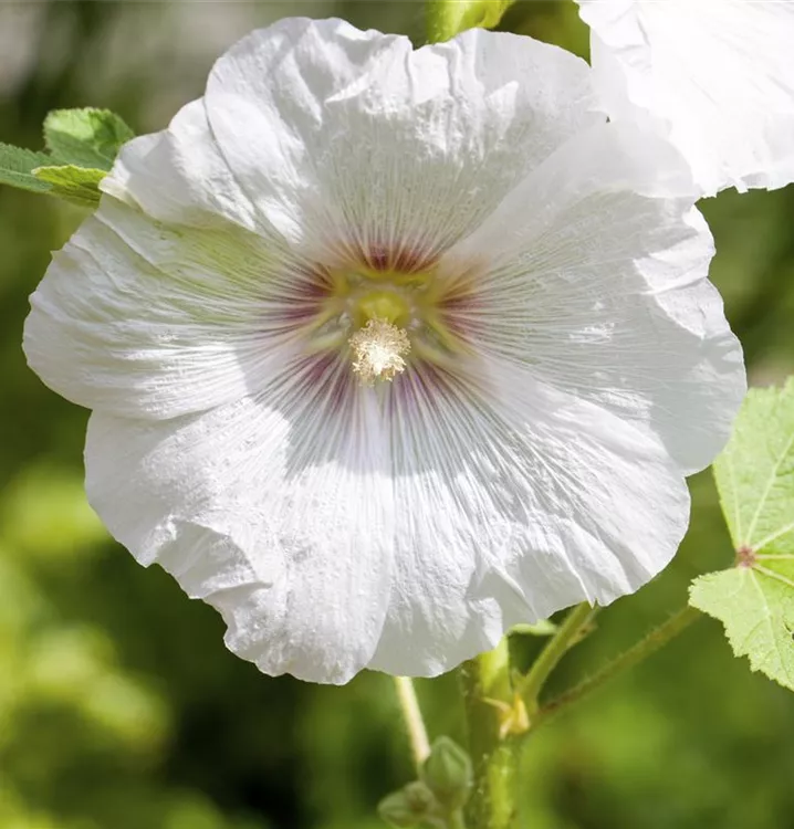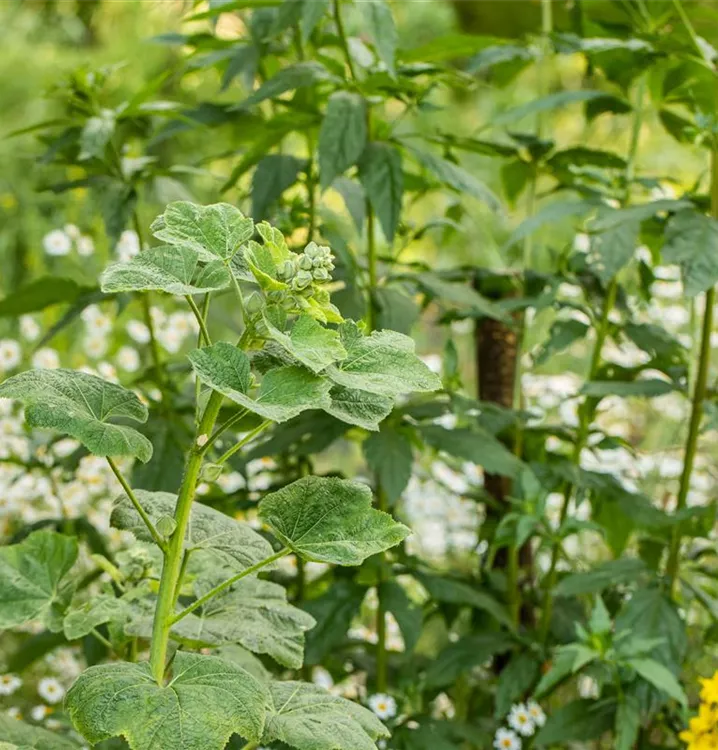 Die sommergrünen Blätter der Stockrose sind mittelgrün, rundlich, gelappt.