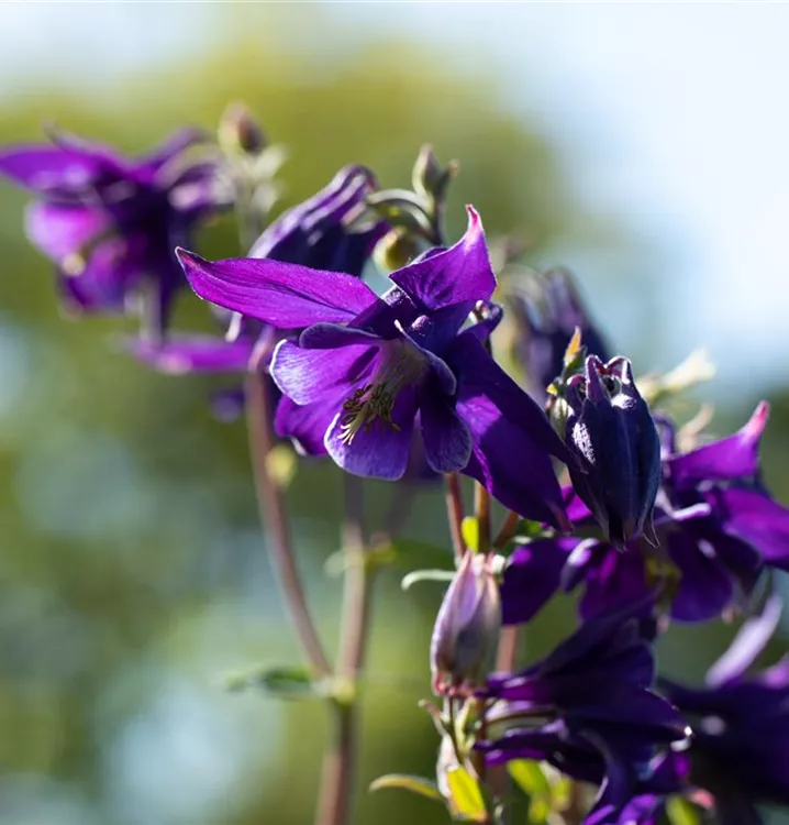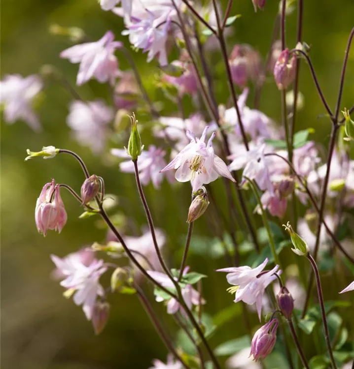 Aquilegia vulgaris bildet glockenförmige, dunkelblaue, violette, rosafarbene, weiße Blüten ab Mai.