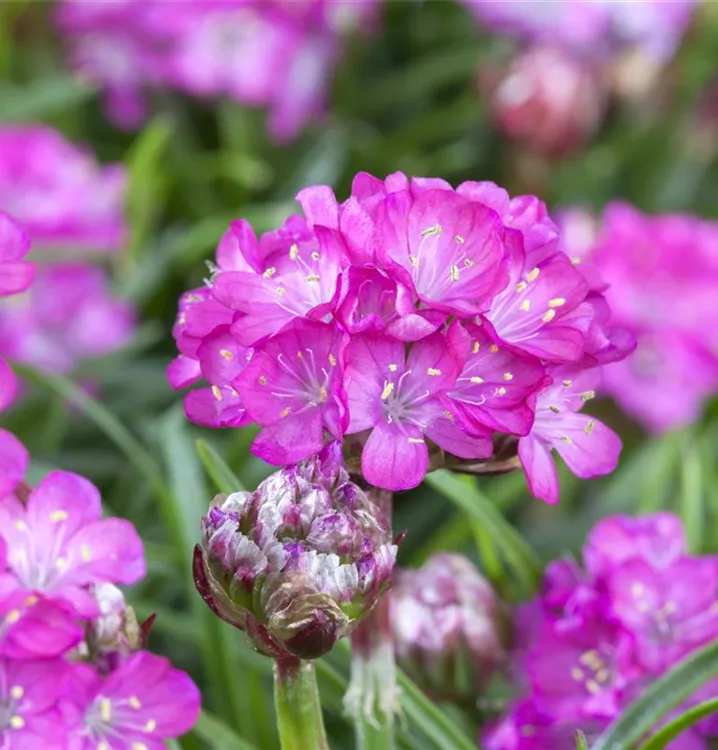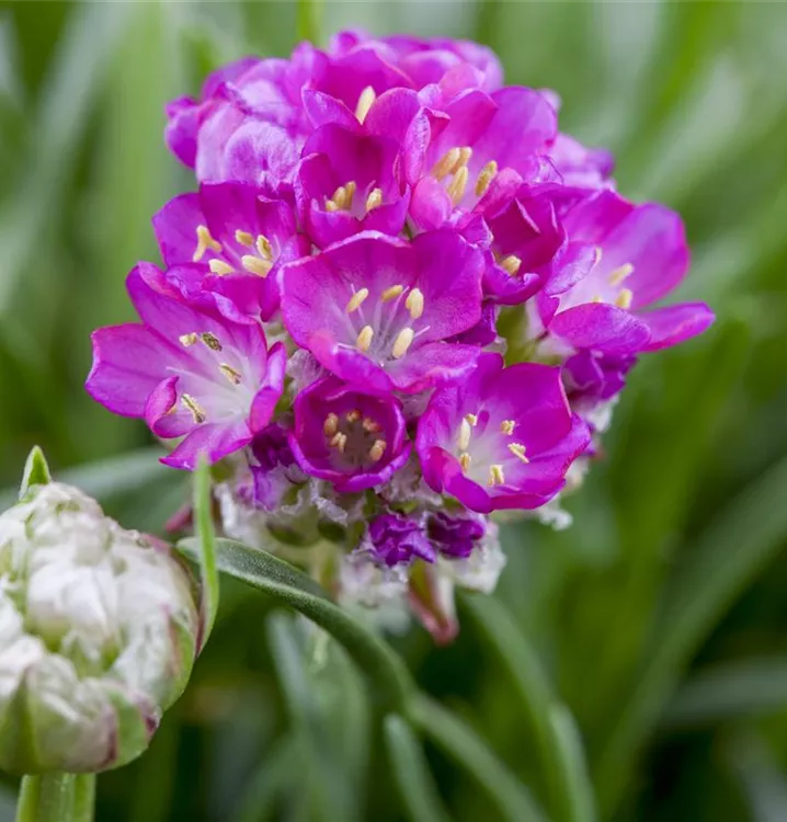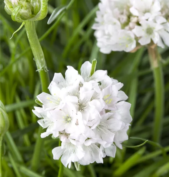 Armeria maritima bildet ballförmige, rosafarbene, weiße Blüten ab Mai.