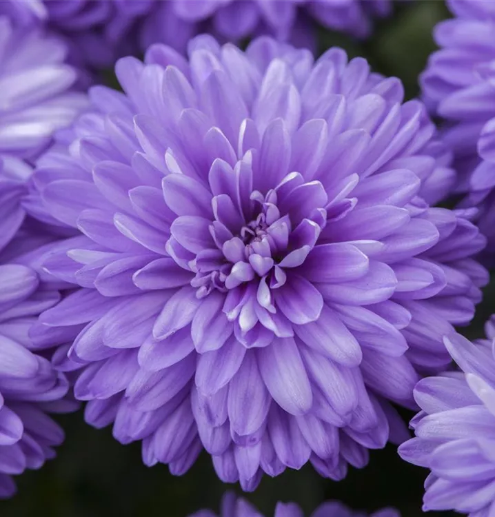 Aster novi-belgii, blau bildet körbchenartige, blaue Blüten ab September. Diese verströmen einen angenehmen Duft.