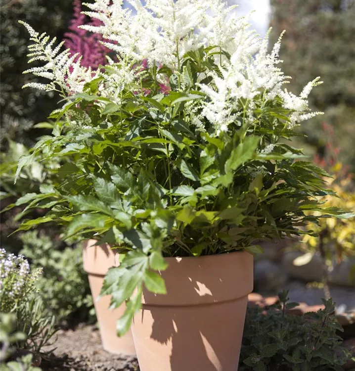 Astilbe x arendsii, weiß bildet in Rispen angeordnete, weiße Blüten ab Juli.