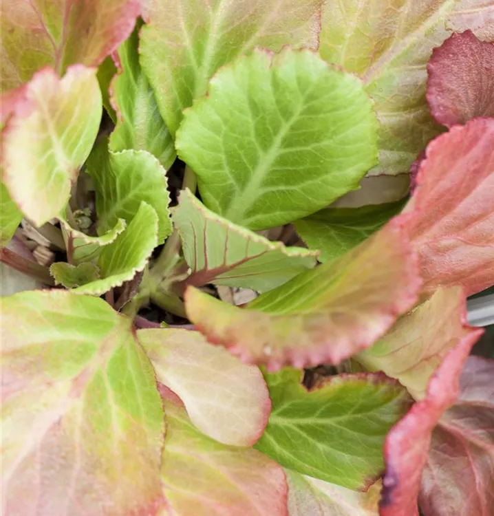Hoher Blattschmuckwert. Die wintergrünen Blätter der Altai-Bergenie sind dunkelgrün, eiförmig. Altai-Bergenie zeigt sich leuchtend rot im Herbst.