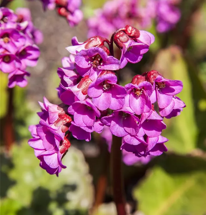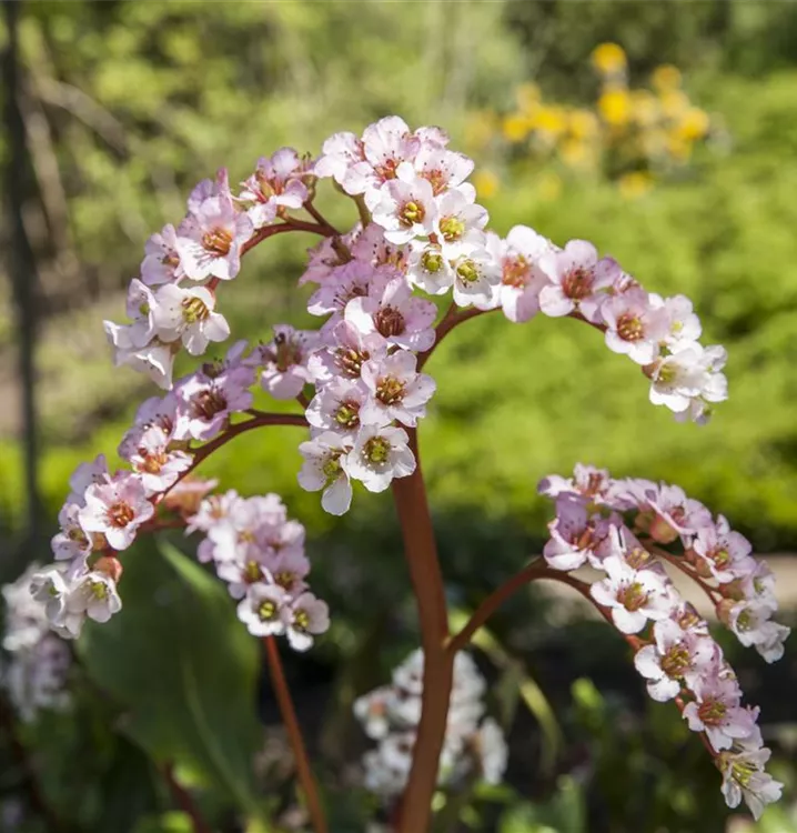 Bergenia cordifolia bildet glockenförmige, in Dolden angeordnete, rosafarbene Blüten ab April. Bei richtiger Pflege Nachblüte von November bis Dezember.