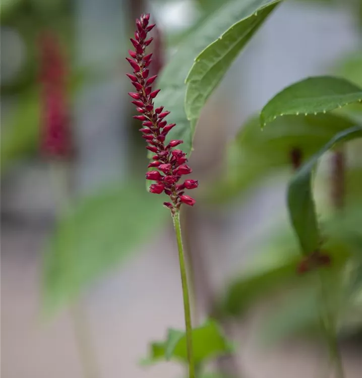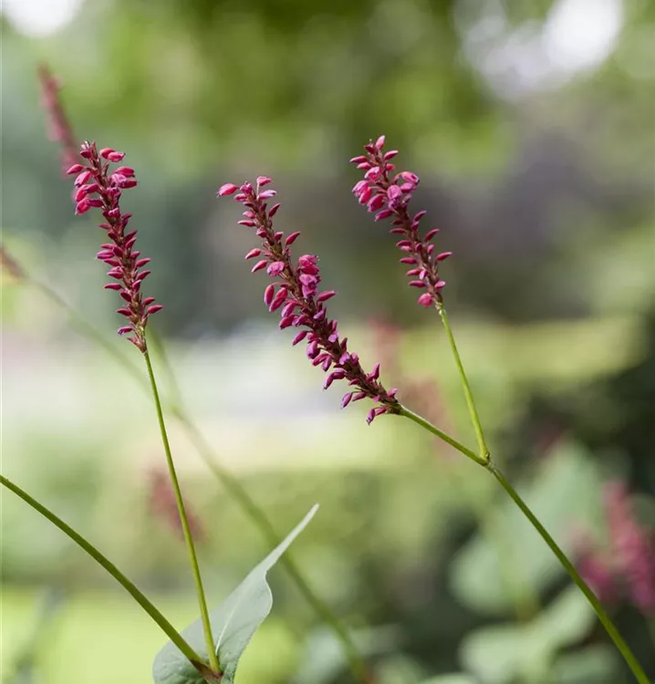 Bistorta amplexicaulis bildet in Rispen angeordnete, scharlachrote Blüten ab Juli.