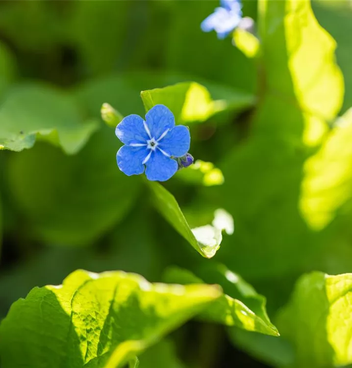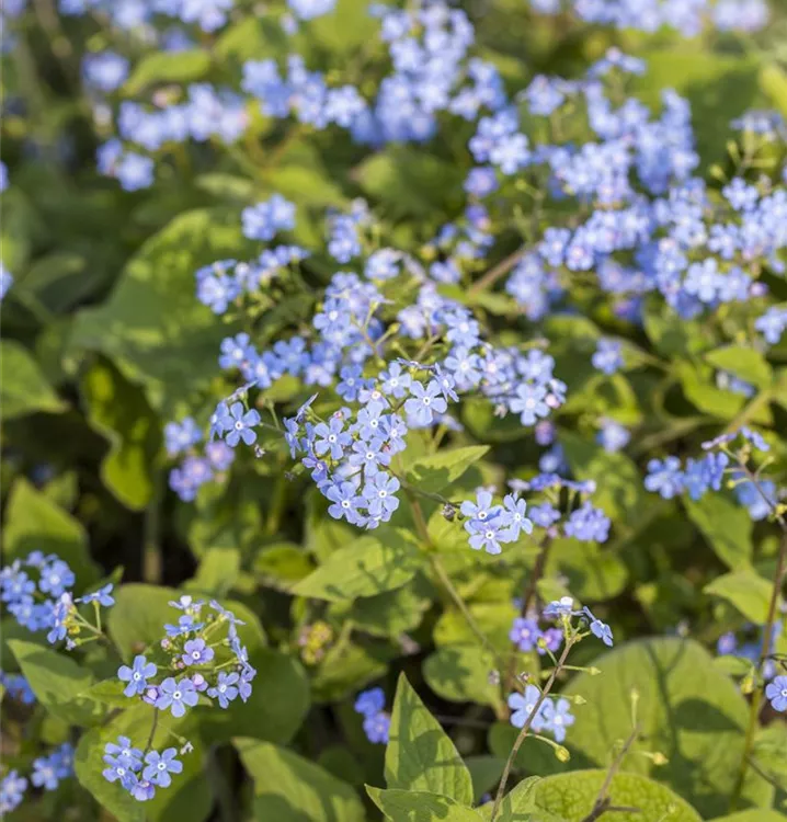 Das Kaukasus-Vergissmeinnicht (Brunnera macrophylla) ist eine ausladende, breite Staude mit dekorativen, herzförmigen, dunkelgrünen Blättern. Von April bis Mai trägt es blaue, radförmige, in Rispen angeordnete Blüten. An einem sonnigen bis halbschattigen Standort mit durchlässigem, humosem, nährstoffreichem, lehmigem Boden erreicht es gewöhnlich eine Höhe von ca. 40 cm und wird ca. 40 cm breit. Das Kaukasus-Vergissmeinnicht ist gut frostverträglich.