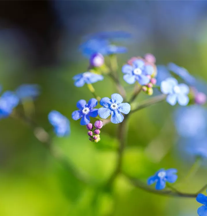 Brunnera macrophylla bildet radförmige, in Rispen angeordnete, blaue Blüten ab April.