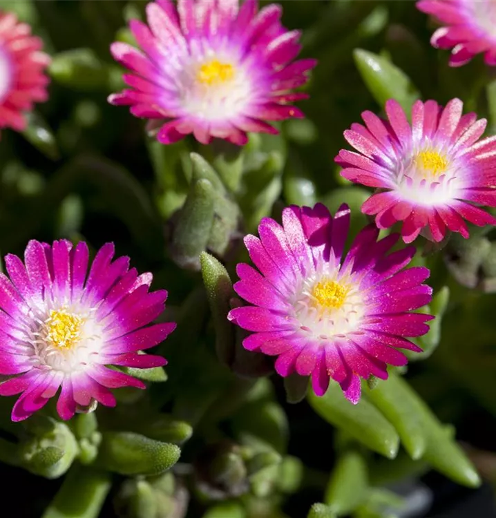 Delosperma cooperi bildet strahlenförmige, körbchenartige, rosafarbene Blüten ab Juni.