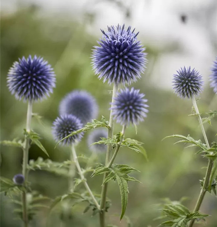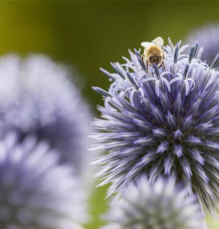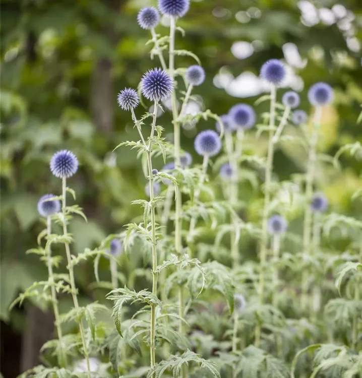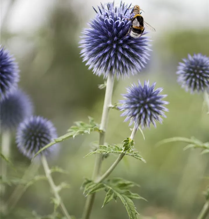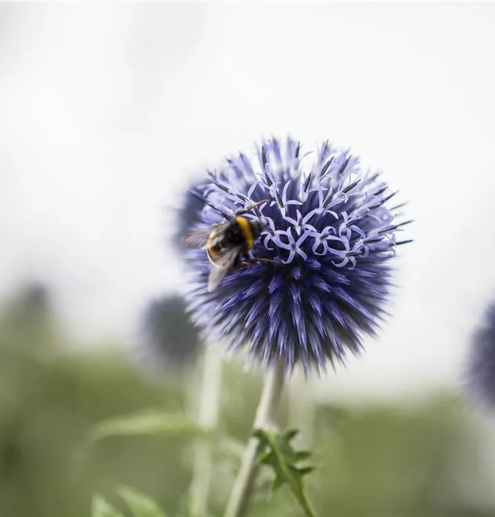 Die Kugeldistel (Echinops ritro) ist eine aufrechte Staude, die von Juli bis September blau-graue, ballförmige Blüten bildet. An einem sonnigen Standort mit durchlässigem, nährstoffreichem Boden erreicht sie gewöhnlich eine Höhe von ca. 1,2 m und wird ca. 40 cm breit. Die Kugeldistel ist gut frostverträglich.