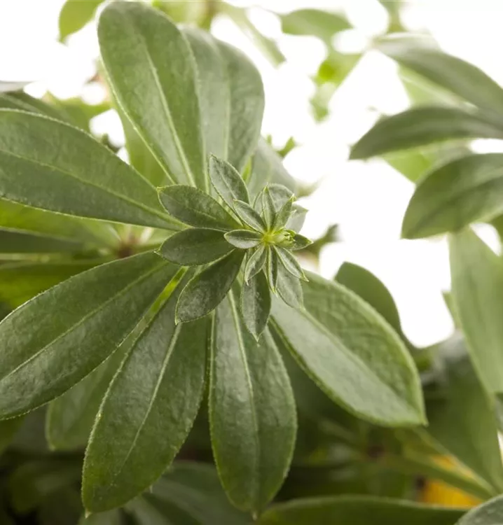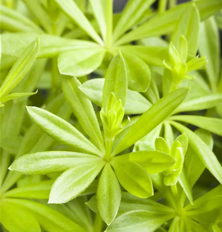 Zum Verzehr geeignet. Die sommergrünen Blätter des Echten Waldmeisters sind dunkelgrün, lanzettlich. Sie verströmen einen angenehmen Duft.