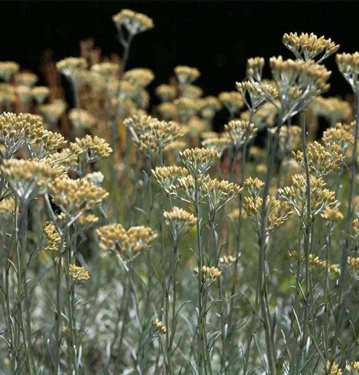 Helichrysum italicum bildet röhrenförmige, in Doldentrauben angeordnete, gelbe Blüten ab Juli.