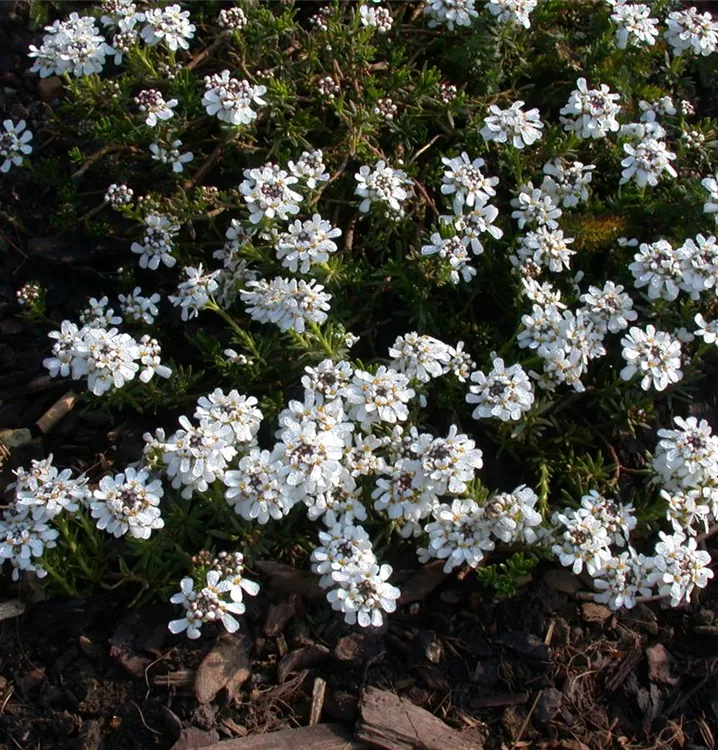 Die Immergrüne Schleifenblume (Iberis sempervirens) ist eine flache, polsterbildende immergrüne Staude, die von April bis Mai weiße, in Dolden angeordnete Blüten bildet. An einem sonnigen Standort mit durchlässigem, nährstoffreichem Boden erreicht sie gewöhnlich eine Höhe von ca. 30 cm und wird ca. 40 cm breit. Die Immergrüne Schleifenblume ist gut frostverträglich.