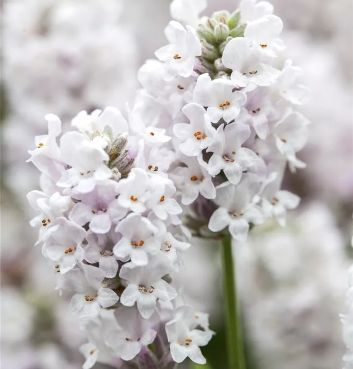 Lavandula angustifolia, weiß bildet rachenförmige, in Rispen angeordnete, weiße Blüten ab Juni. Diese verströmen einen angenehmen Duft.