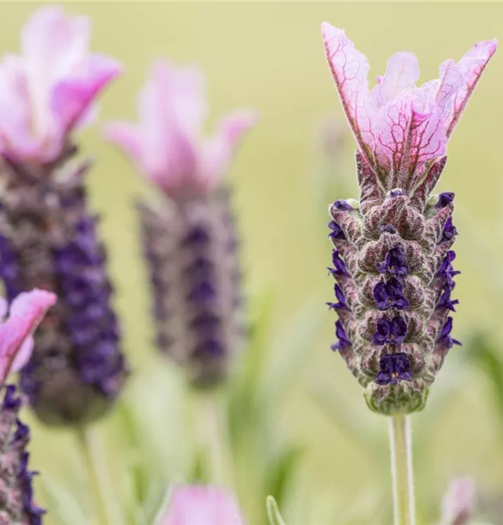 Lavandula stoechas, rosa bildet rosafarbene Blüten ab Juli. Diese verströmen einen angenehmen Duft.