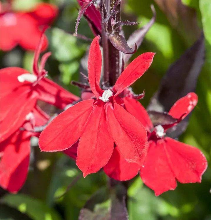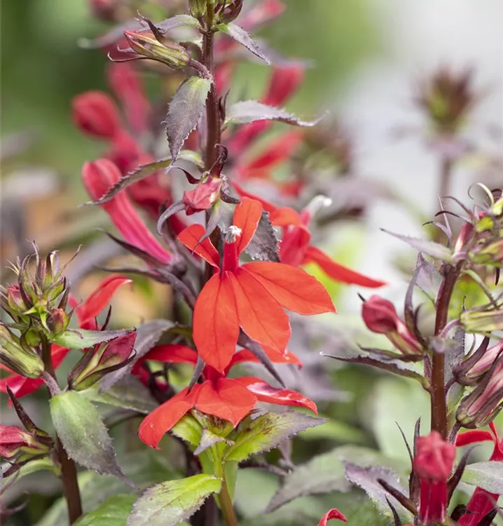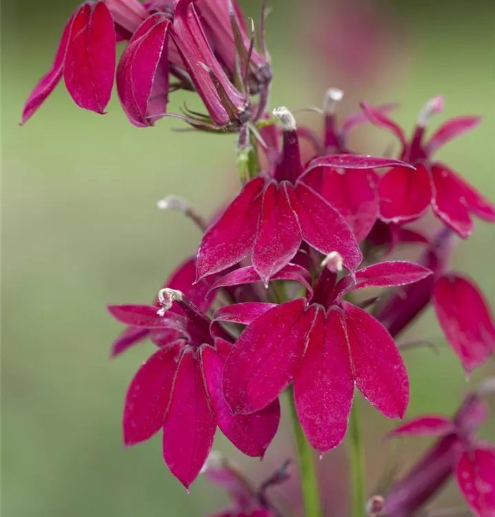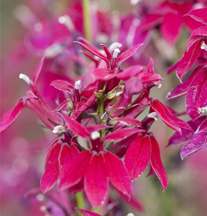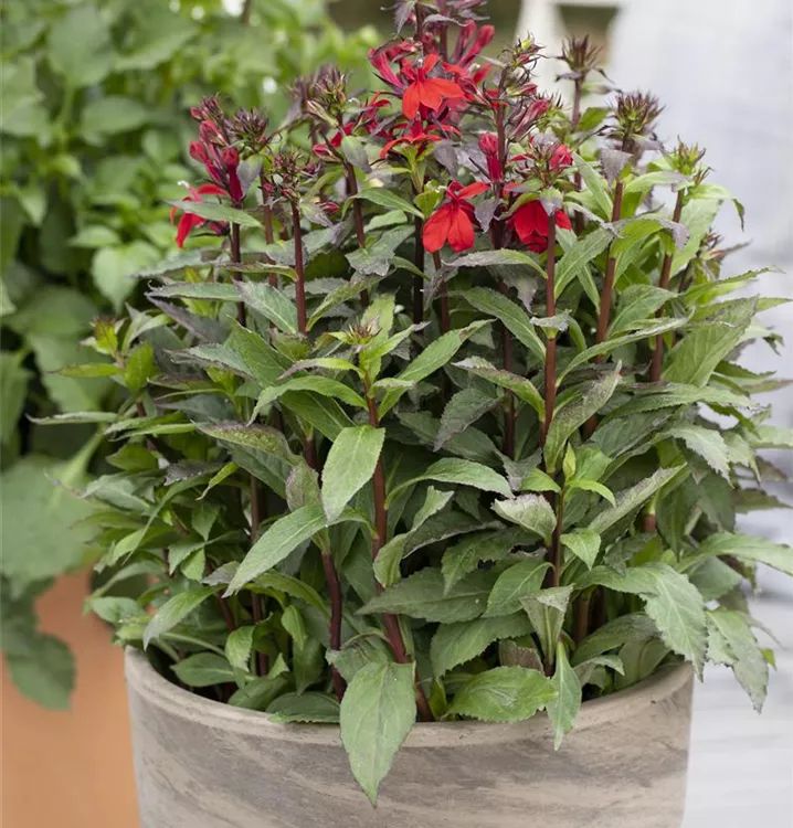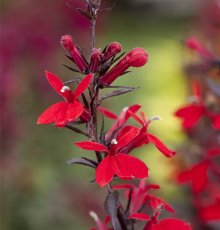 Die Lobelie (Lobelia x speciosa) ist eine aufrechte Staude, die, je nach Sorte, Blüten in verschiedenen Farben bildet. An einem sonnigen bis halbschattigen Standort mit durchlässigem, nährstoffreichem Boden erreicht sie gewöhnlich eine Höhe von ca. 1,2 m und wird ca. 80 cm breit. Die Lobelie ist gut frostverträglich.