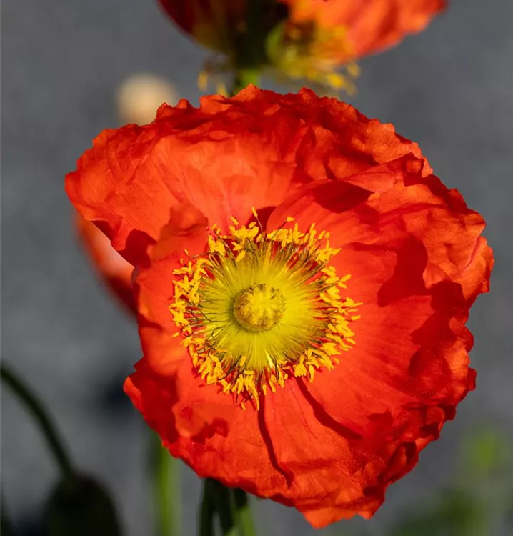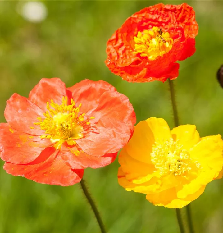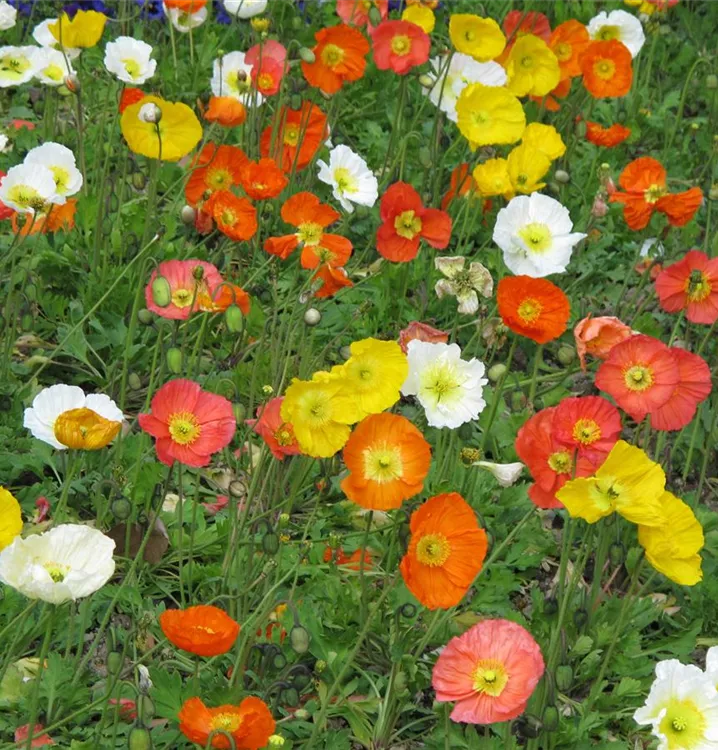 Papaver nudicaule bildet schalenförmige, rote, orangefarbene, gelbe, weiße Blüten ab Mai.
