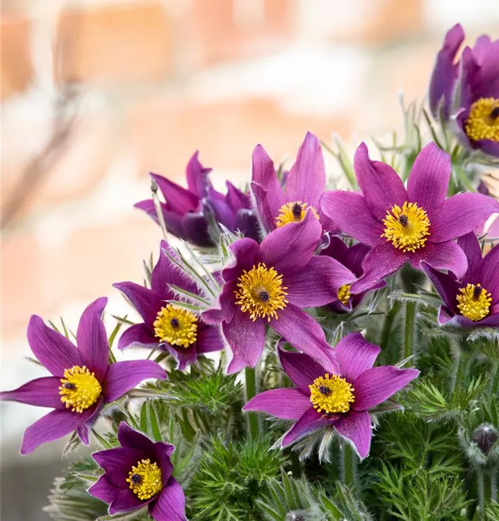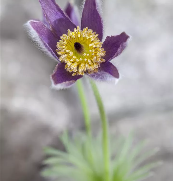 Pulsatilla vulgaris bildet glockenförmige, blauviolette Blüten ab März.