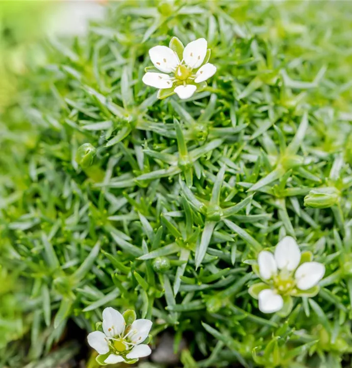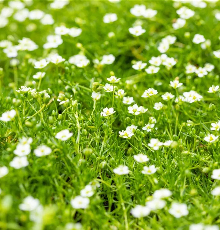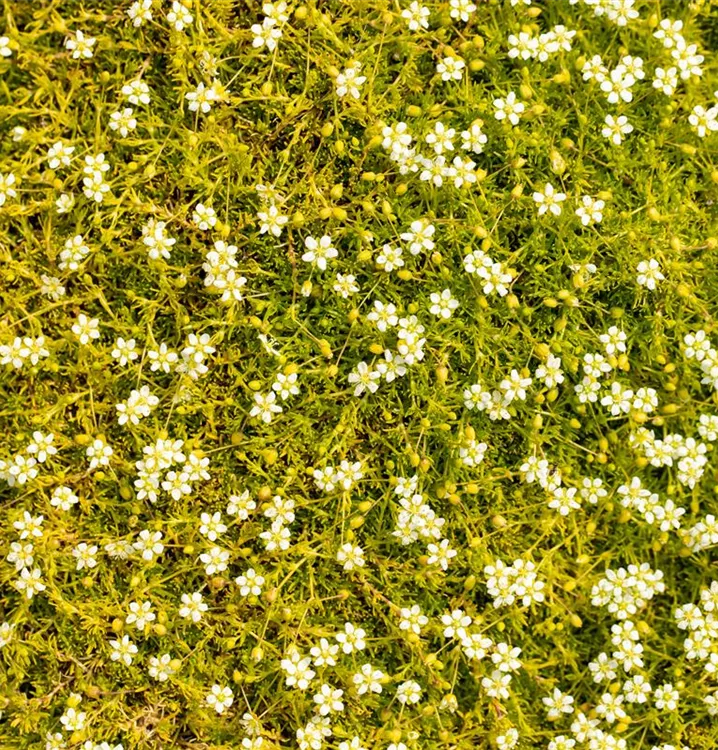 Sagina subulata bildet sternförmige, weiße Blüten ab Juni.