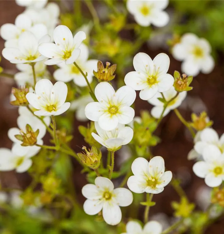 Kennzeichnend für den Garten-Moossteinbrech Gruppe 'Touran' sind seine grünen, weichblättrigen Rosetten, die hübsche Polster bilden. Diese sterben auch nach der Blüte nicht ab und haben daher sogar im Winter noch einen Zierwert. Von April bis Mai schmücken dazu noch viele kleine weiße, rote oder rosafarbenen Blüten dieses pflegeleichte Steingartengewächs. Obwohl der Steinbrech relativ gut mit kurzen Trockenperioden zurechtkommt, sollte sein Standort nicht in der prallen Sonne gewählt werden.