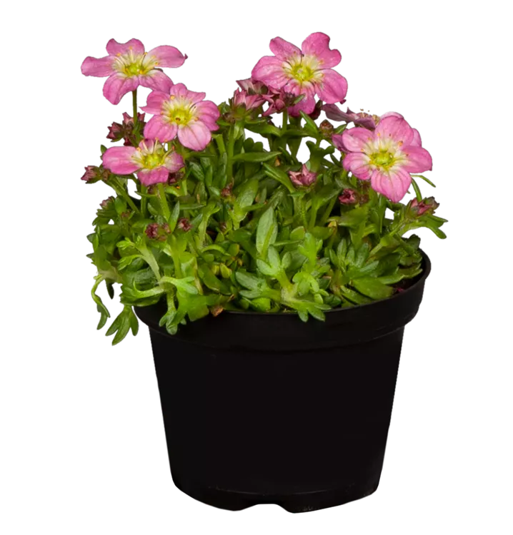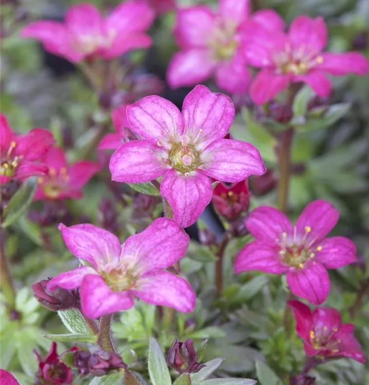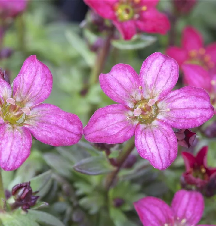 Saxifraga x arendsii, rosa bildet schalenförmige, rosafarbene Blüten ab April.