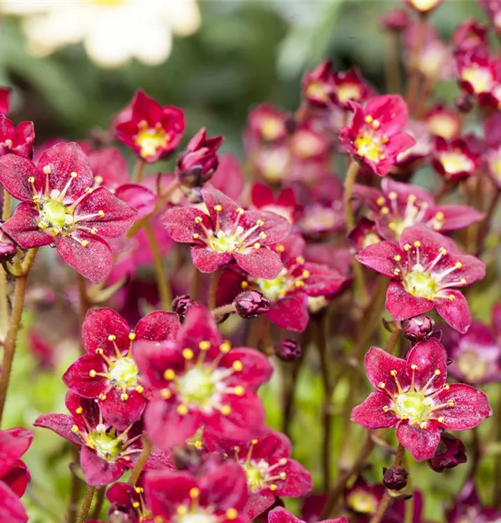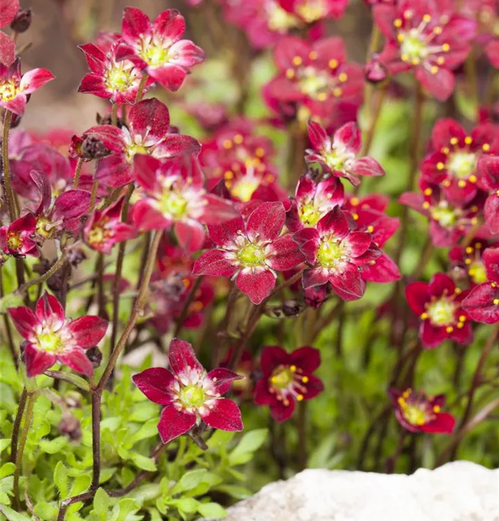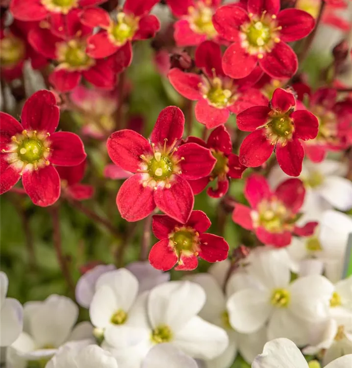 Saxifraga x arendsii, rot bildet schalenförmige, rote Blüten ab April.