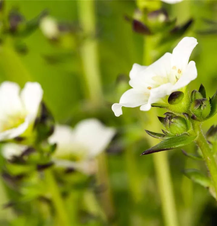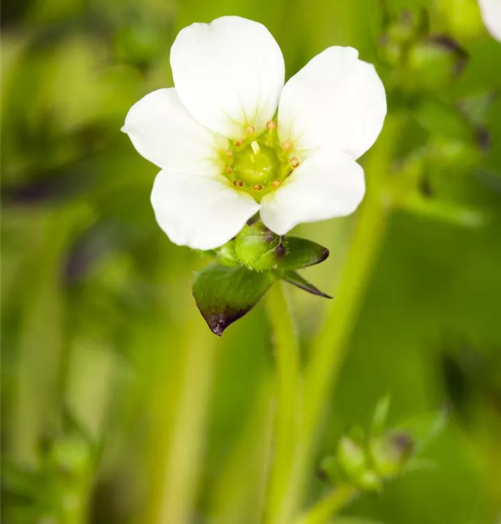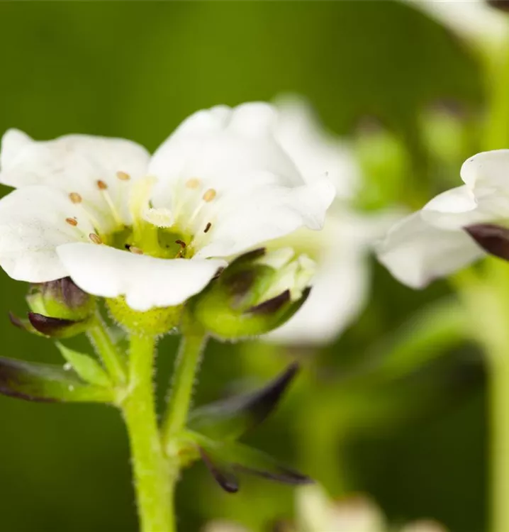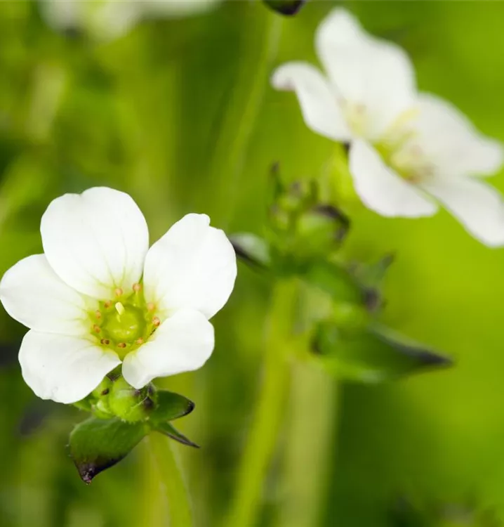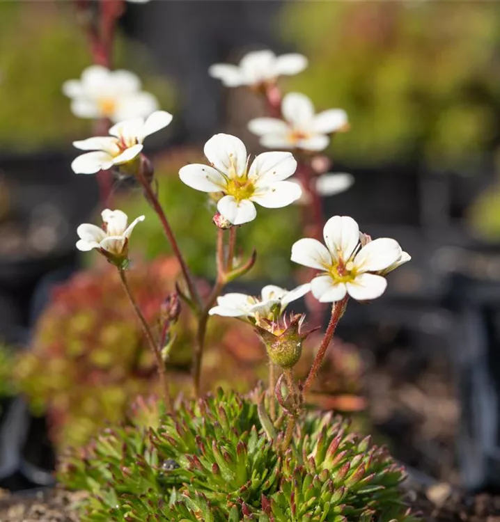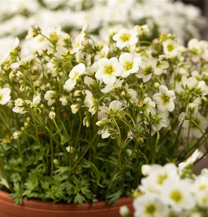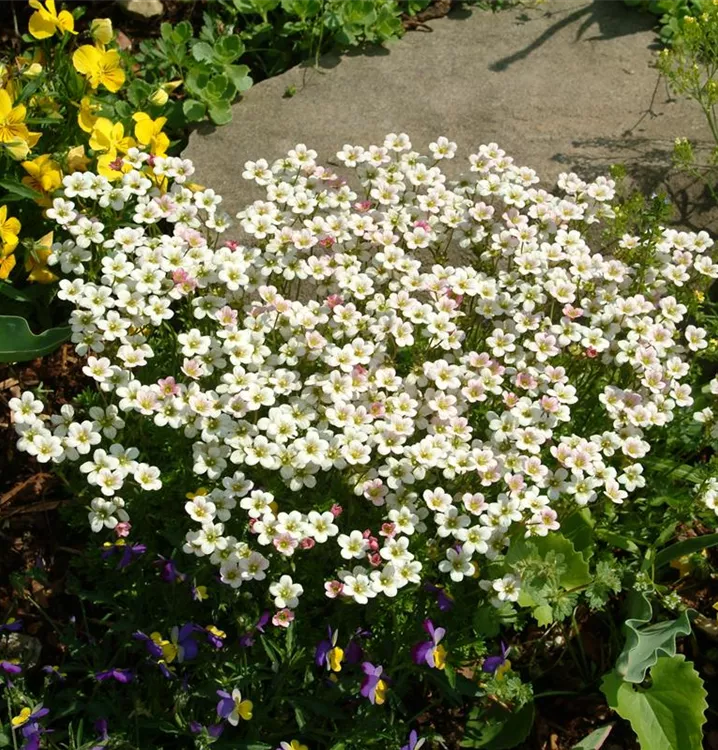 Saxifraga x arendsii, weiß bildet schalenförmige, weiße Blüten ab April.