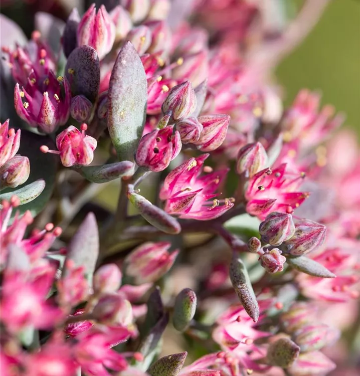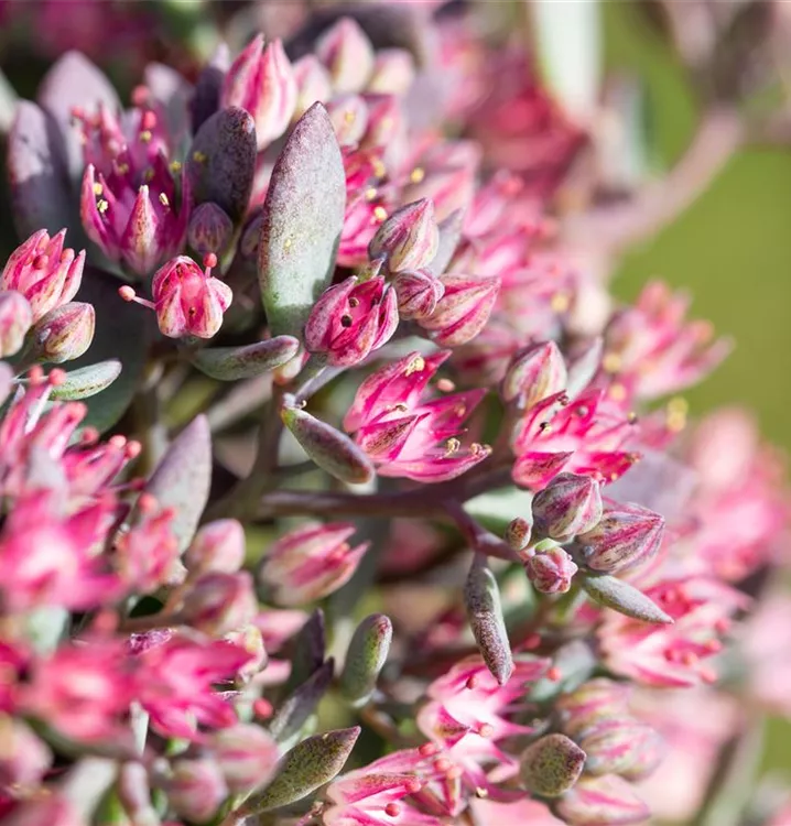 Sedum cauticola bildet sternförmige, in Dolden angeordnete, pinke Blüten ab August.