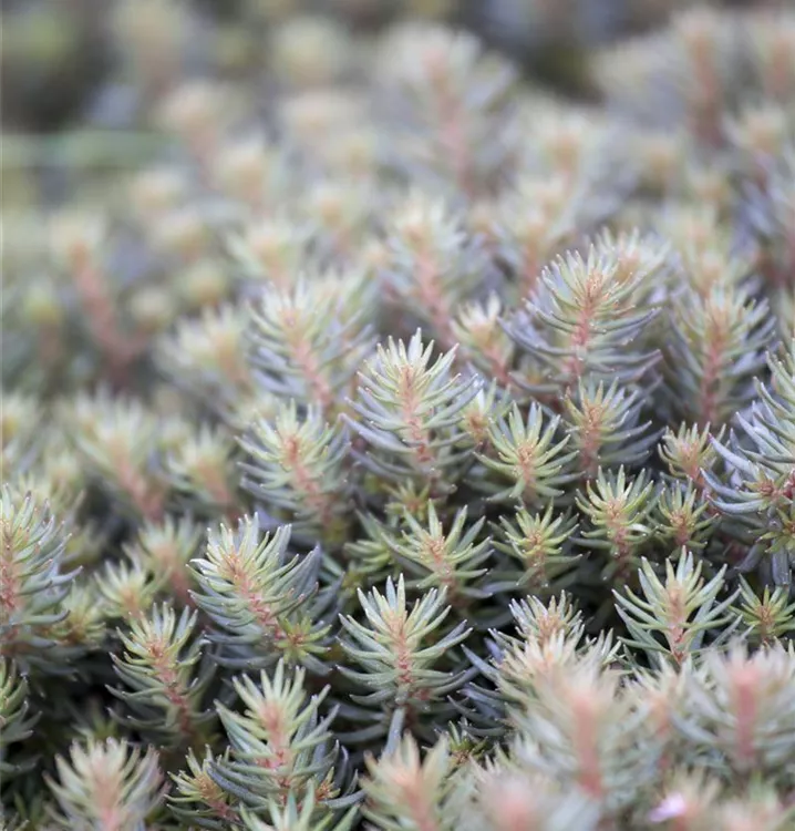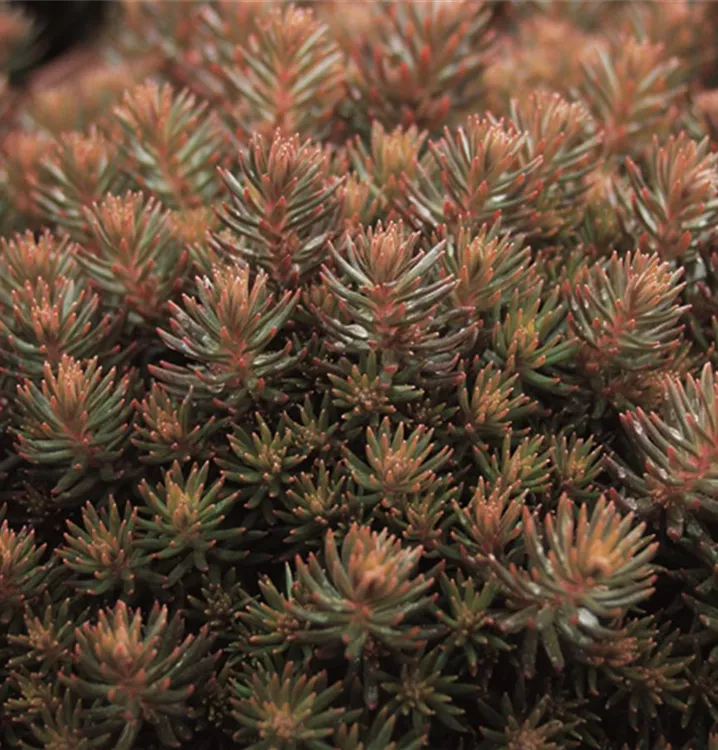 Das Nickende Garten-Fettblatt 'Chocolate Ball' (Sedum reflexum) ist eine lockere, kriechende, teppichartige wintergrüne Staude, die von Juli bis August gelbe, in Dolden angeordnete Blüten bildet. An einem sonnigen Standort mit durchlässigem Boden erreicht es gewöhnlich eine Höhe von ca. 25 cm und wird ca. 25 cm breit. Das Nickende Garten-Fettblatt 'Chocolate Ball' ist gut frostverträglich.