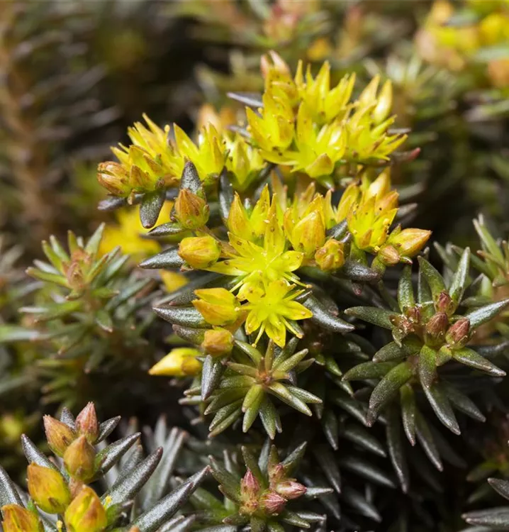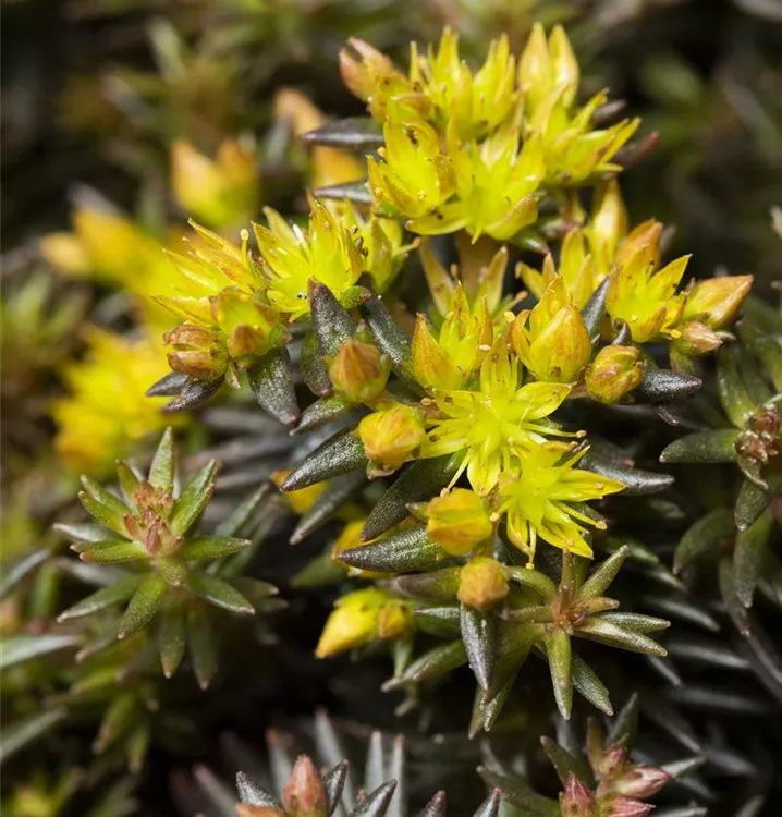 Sedum reflexum 'Chocolate Ball' bildet in Dolden angeordnete, gelbe Blüten ab Juli.