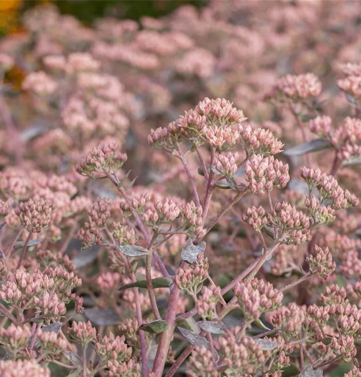Sedum telephium bildet in Dolden angeordnete, rosafarbene Blüten ab August.
