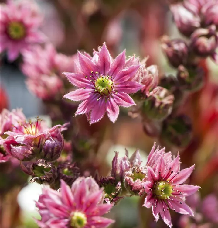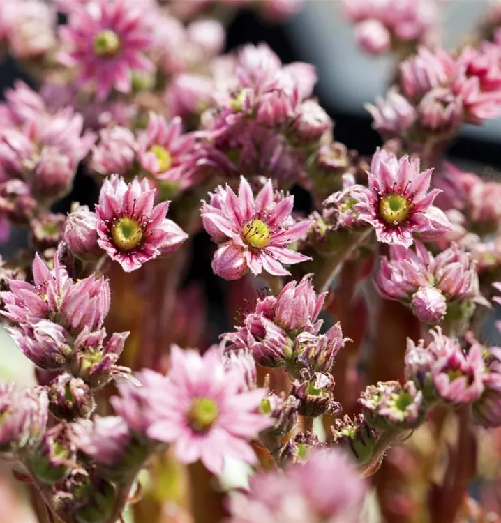 Sempervivum arachnoideum bildet karminrote Blüten ab Juni.