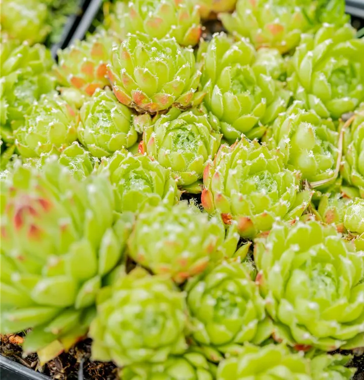 Die Spinnwebige Steinrose (Sempervivum arachnoideum) ist eine polsterbildende, rosettenartige immergrüne Staude, die von Juni bis Juli karminrote Blüten bildet. An einem sonnigen Standort mit lockerem, trockenem Boden erreicht sie gewöhnlich eine Höhe von ca. 15 cm und wird ca. 20 cm breit. Die Spinnwebige Steinrose ist an geschützten Standorten gut frostverträglich.