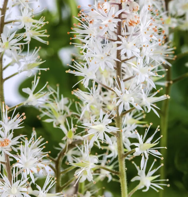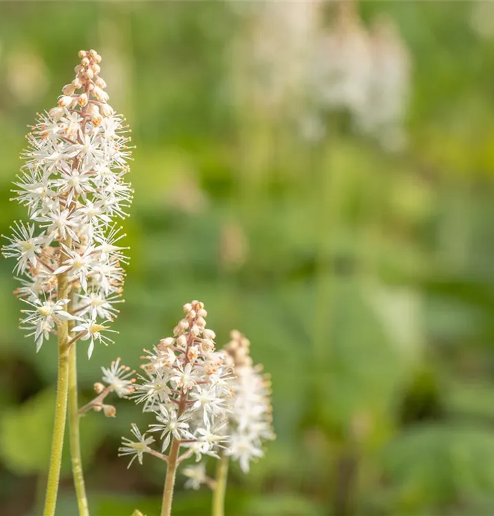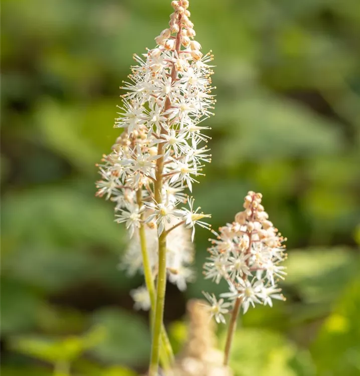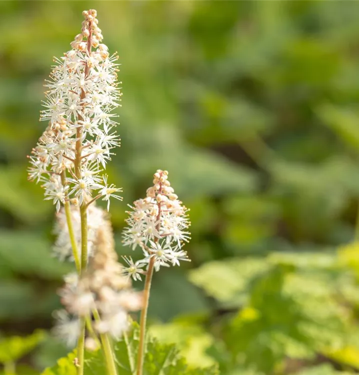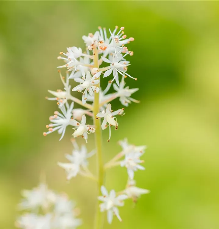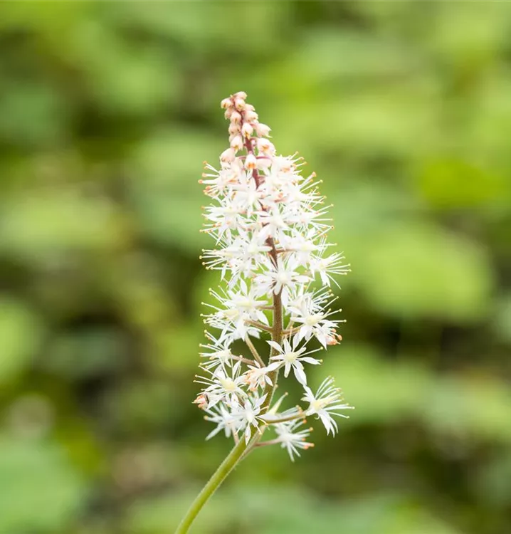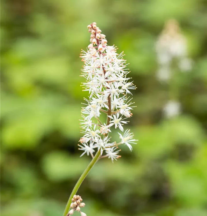 Tiarella cordifolia bildet in Doldentrauben angeordnete, weiße Blüten ab Mai. Diese verströmen einen angenehmen Duft.