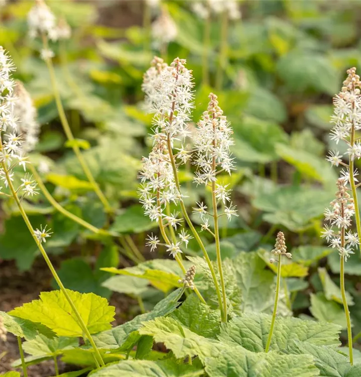 Die Herzblättrige Schaumblüte (Tiarella cordifolia) ist eine ausläuferbildende, buschige, aufrechte, breite, wintergrüne Staude mit dekorativen, herzförmigen, mittelgrünen Blättern. Von Mai bis Juni trägt sie weiße, in Doldentrauben angeordnete Blüten mit einem angenehmen Duft. An einem halbschattigen bis schattigen Standort mit humosem, lockerem Boden erreicht sie gewöhnlich eine Höhe von ca. 20 cm und wird ca. 30 cm breit. Die Herzblättrige Schaumblüte ist gut frostverträglich.