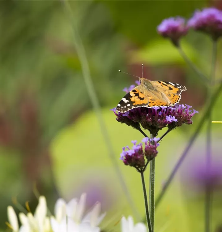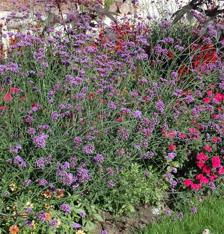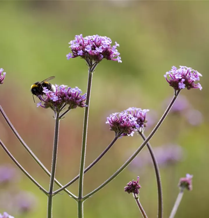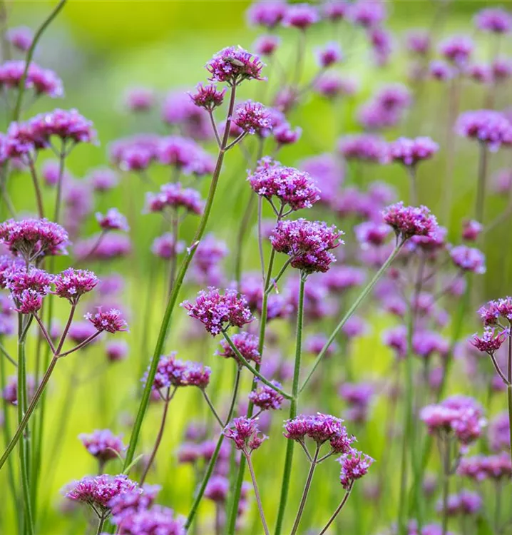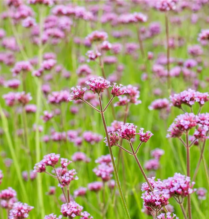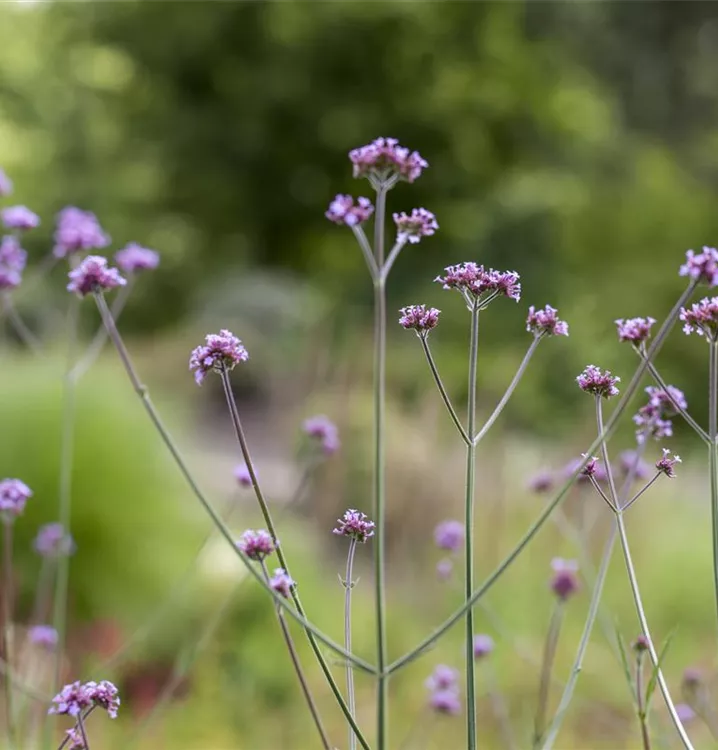 Verbena bonariensis bildet in Dolden angeordnete, magentafarbene Blüten ab Juli.