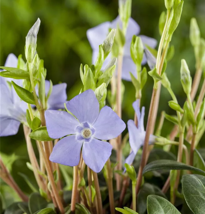 Vinca minor bildet radförmige, blaue Blüten ab Mai. Bei richtiger Pflege Nachblüte im September.