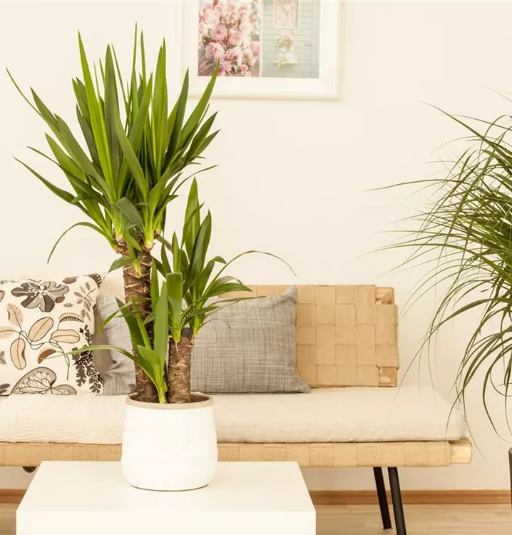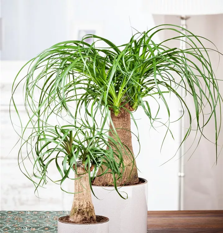 Der Elefantenfuß (Beaucarnea recurvata) trägt mittelgrüne, lineale, ganzrandige Blätter. Diese sukkulente Pflanze gedeiht am besten an einem sonnigen Standort.