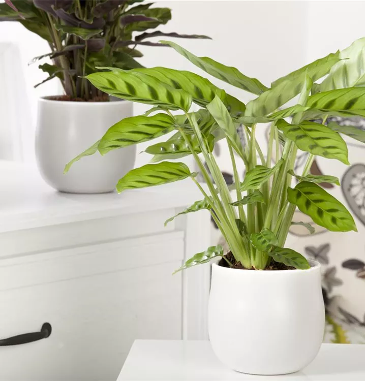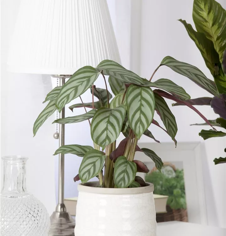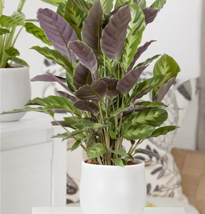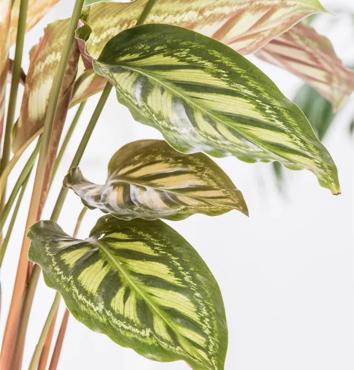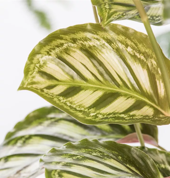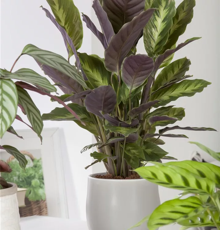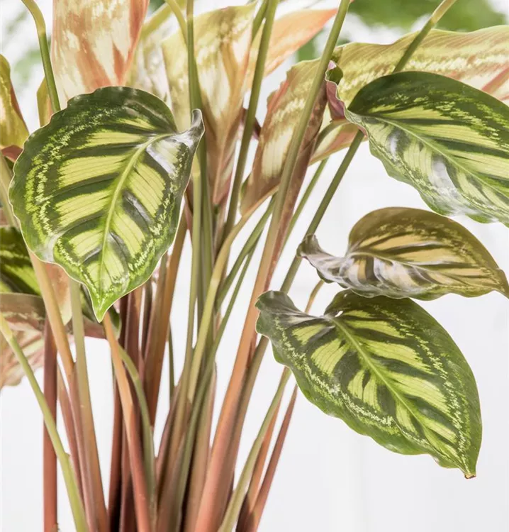Die Korbmarante (Calathea) ist eine Pflanze mit dekorativen, mehrfarbigen Blättern. Sie sind eiförmig und gewellt. Diese buschige und aufrechte Pflanze gedeiht am besten an einem halbschattigen Standort.