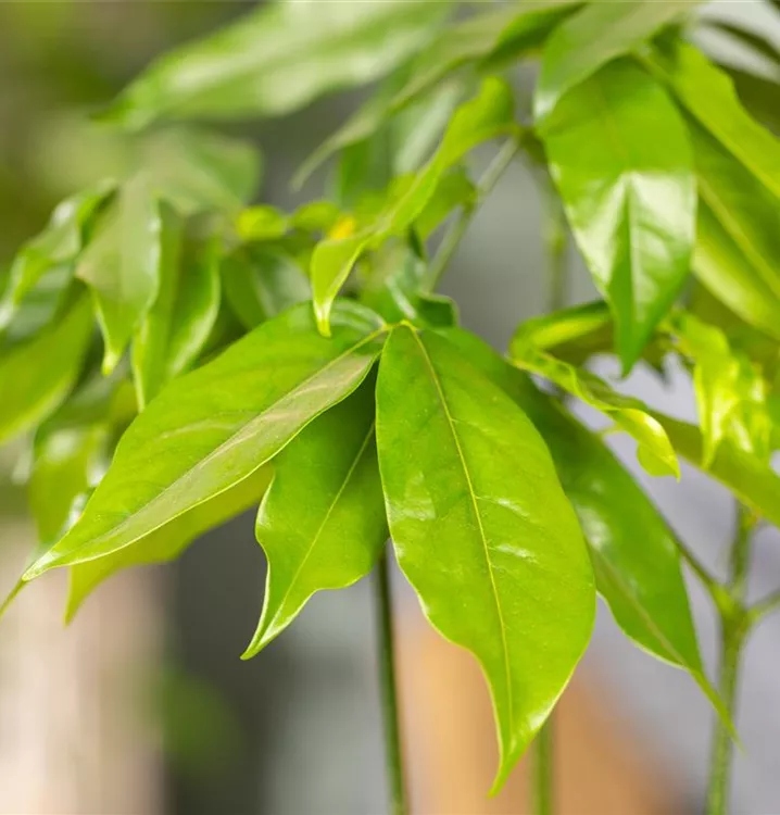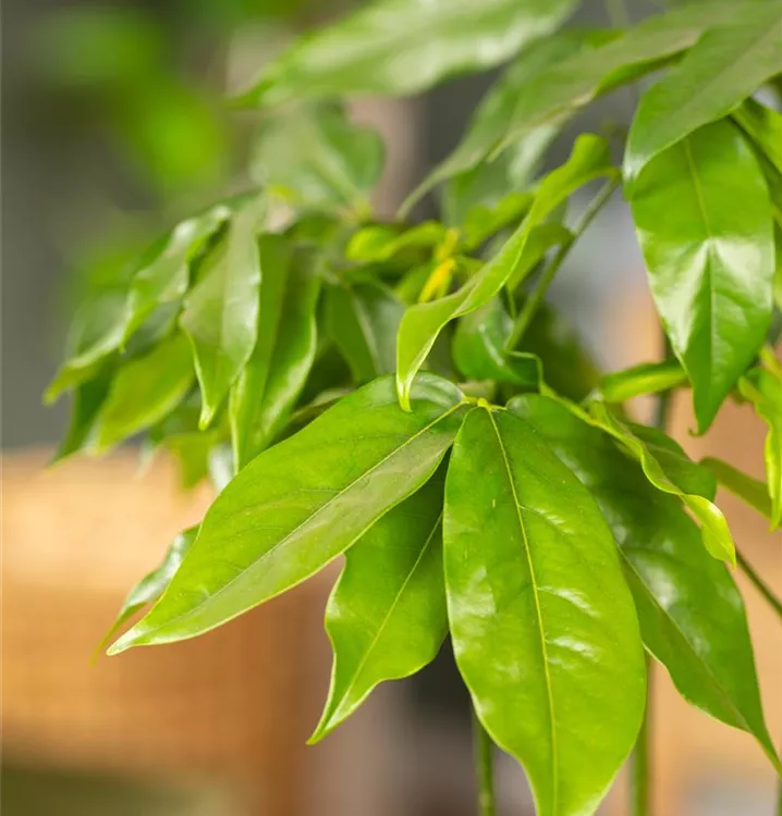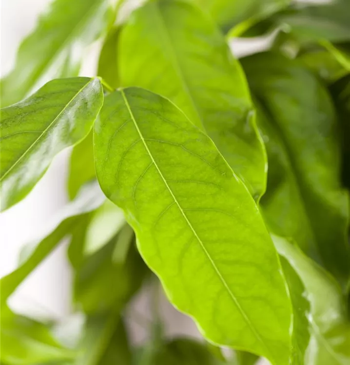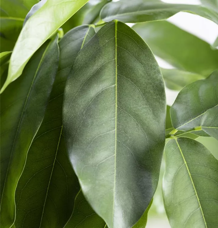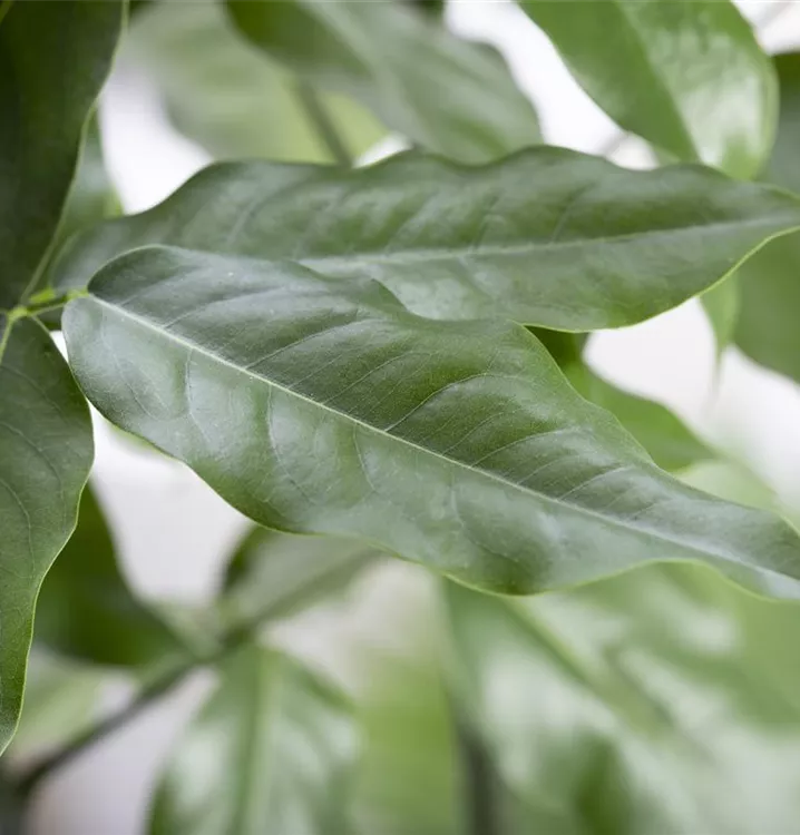 Die sommergrünen Blätter der Australische Kastanie sind dunkelgrün, lanzettlich, glänzend.