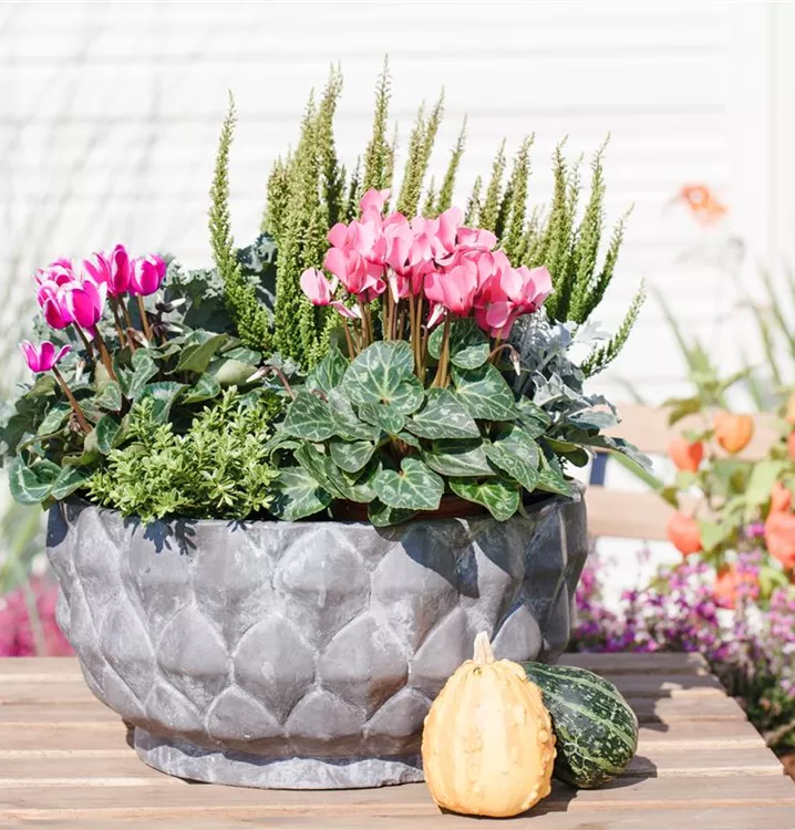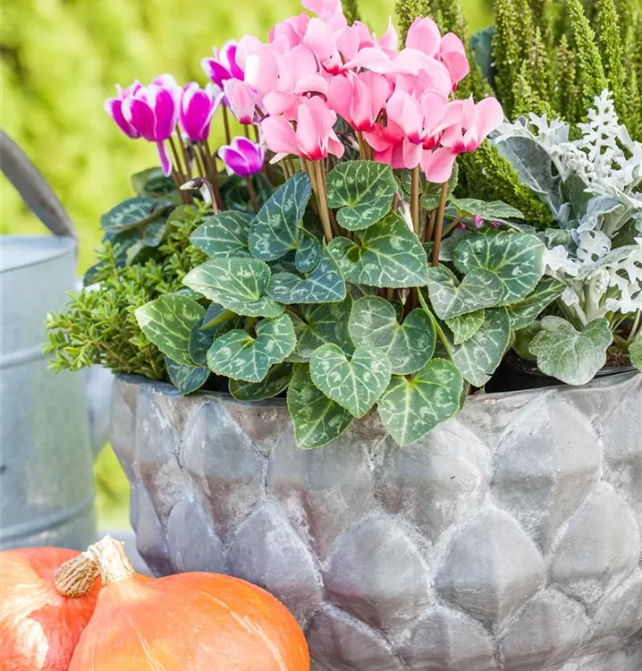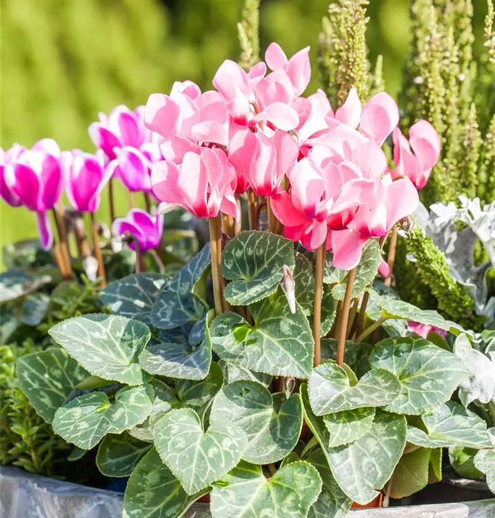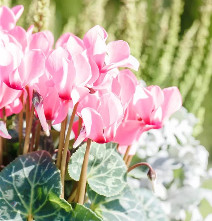 Das Alpenveilchen 'Out-Land' (Cyclamen persicum 'Out-Land') blüht über Monate hinweg. Je nach Sorte, erscheinen die dekorativen Blüten in den Farben Weiß, Pink, Rosa, Rot, Dunkelrot und Lila. Die mehrfarbigen, herzförmigen Blätter sind gezähnt. Bevorzugt wird ein sonniger bis halbschattiger Standort und eine durchlässige Erde.