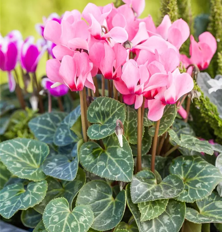 Die wintergrünen Blätter des Alpenveilchens 'Out-Land' sind mehrfarbig, herzförmig, gezähnt.