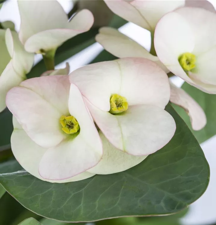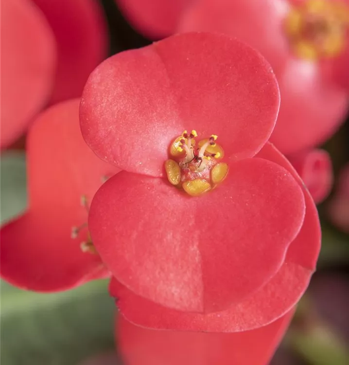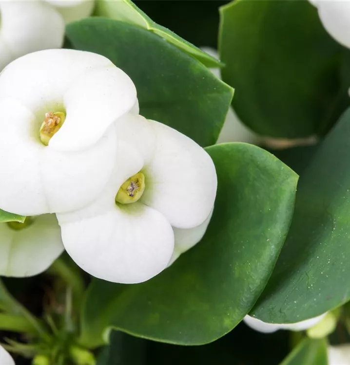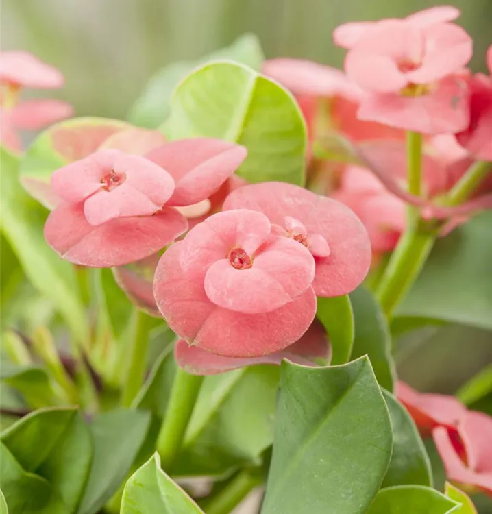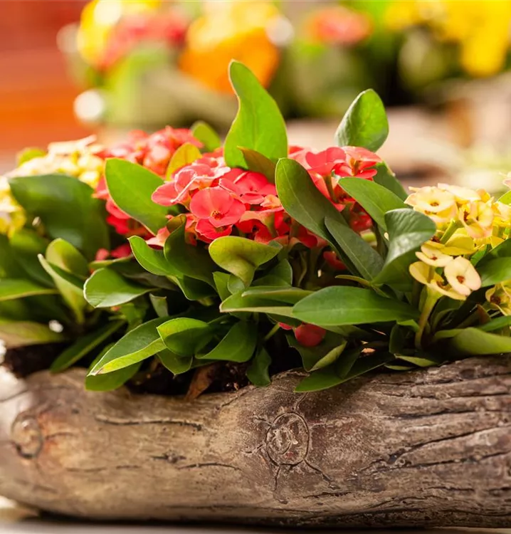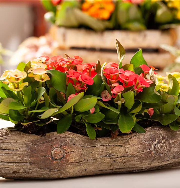 Der Christusdorn (Euphorbia milii) ist eine Pflanze mit mittelgrünen, lanzettlichen Blättern. Seine tellerförmigen Blüten sind rot und erscheinen in Trugdolden von November bis April. Diese kompakte und strauchartige Pflanze gedeiht am besten an einem sonnigen Standort.